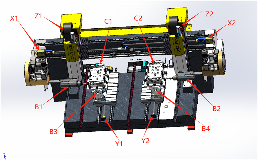 數控系統(雙頭雙通道);(品牌廠家待確認) X1X2軸(型號待確認)伺服電機; Y1Y2軸(型號待確認)伺服電機; Z1Z2軸(型號待確認)伺服電機、帶抱閘; B1B2軸(型號待確認)伺服電機、帶抱閘; B3B4軸(型號待確認)伺服電機、帶抱閘; C1C2軸(型號待確認)伺服電機、帶抱閘; 2-主軸電機15-18000; |